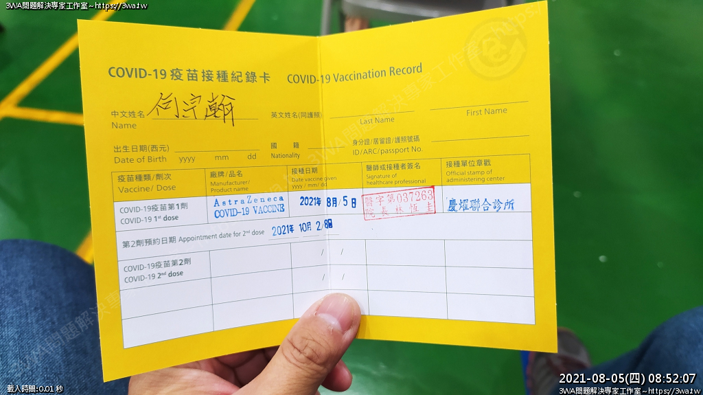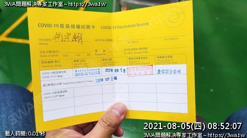 | 內容說明:2021.08.05打AZ疫苗 | 瀏覽人數: 1237 |