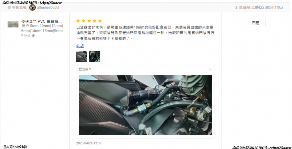 | 內容說明:2023.04.24勁戰單向閥 10mm 感謝車友 allenlee0503 分享 | 瀏覽人數: 533 |